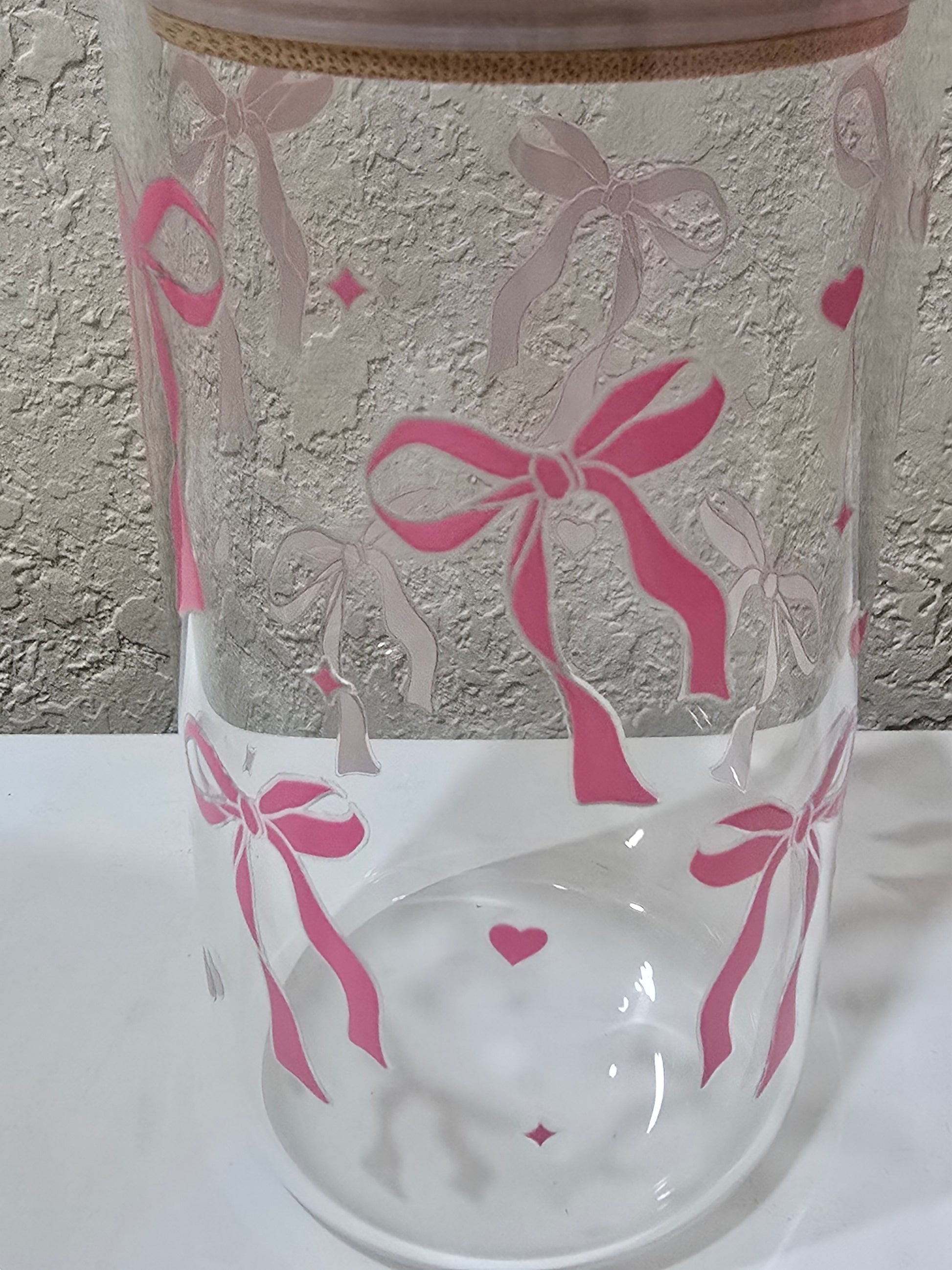 16 oz. Pink Bows and Hearts Glass Cup Iced Coffee Cocktail Tumbler with Lid and Straw