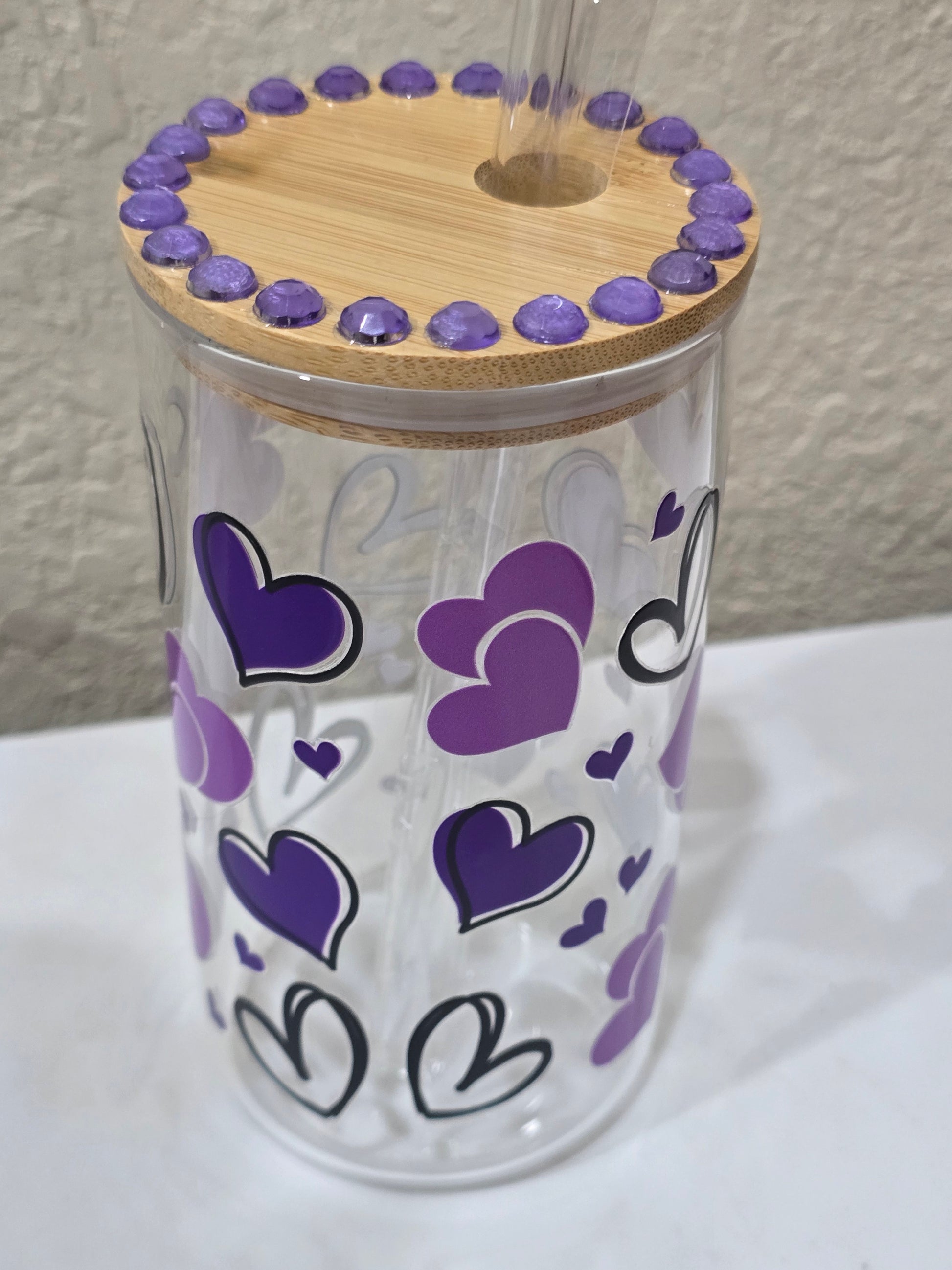 16 OZ. Purple and Black Hearts with Rhinestones Glass Cup Iced Coffee Cocktail Tumbler with Lid and Straw
